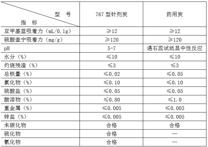 備注:767型針劑炭檢測執行標準為《中國藥典》2015版四部;藥用炭檢測執行標準為《中國藥典》2015版二部。客戶另有要求或增加檢測項目,可按照具體要求生產和檢測。