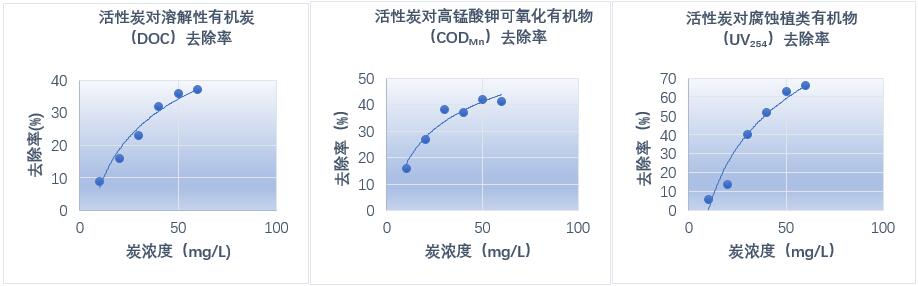 產品在3nm附近孔分布較多的特點賦予其對水中較大分子有機物DOC、CODMn和UV254具有較高吸附性能。